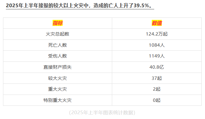 2025年上半年,全国消防救援队伍共接报火灾55.2万起,亡1084人、伤1149人,直接财产损失40.8亿元。因电气故障、用火不慎引发火灾占比25.4%。造成的死亡人数上升了39.5%